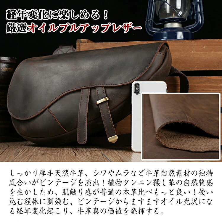 ショルダーベルト調節可能長さ: 70cm〜135cm(幅3cm) 重さ 約0.5kg 素材 厚手牛革 仕様 メイン収納ポケット*1 内部:小物入れポケット*2 前マグネット式フラップ*1、 前ZIPポケット*1 カラー ダークブラウン色 コメント 新作厚手牛革ボディバック颯爽登場!お薦めのメインポイントが三つ: 【厳選オイルプルアップレザー】 贅沢な一枚厚手牛革素材を採用、植物タンニン鞣しオイルレザーに加工されており、牛革独特な自然な素材感が溢れ、使い込むほど人体と馴染め、ますます綺麗なオイル光沢になる経年変化が楽しみ。