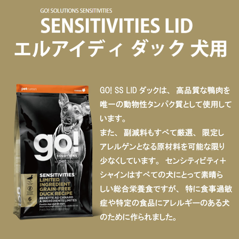 商品名 ゴー GO! LIDダック(鴨) 商品説明 GO! LIDダックは、放し飼いで健康に育った高品質な鴨肉を唯一の動物性タンパク質として使用したアレルギー対応のフードです。