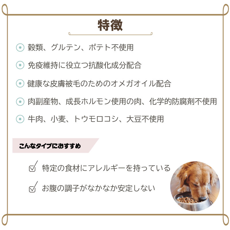 アレルギーの悩みがない全ての犬たちにとっても、食材の味わいを最大限に生かした美味しい総合栄養食となり、フードローテーションにもおすすめです。